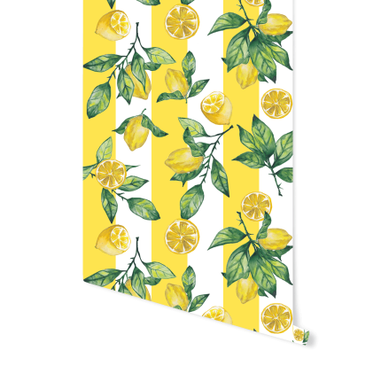 This classical striped wallpaper is a popular, energetic companion and pairs well with the Striped Lemon, Lemon Branch or Lemon