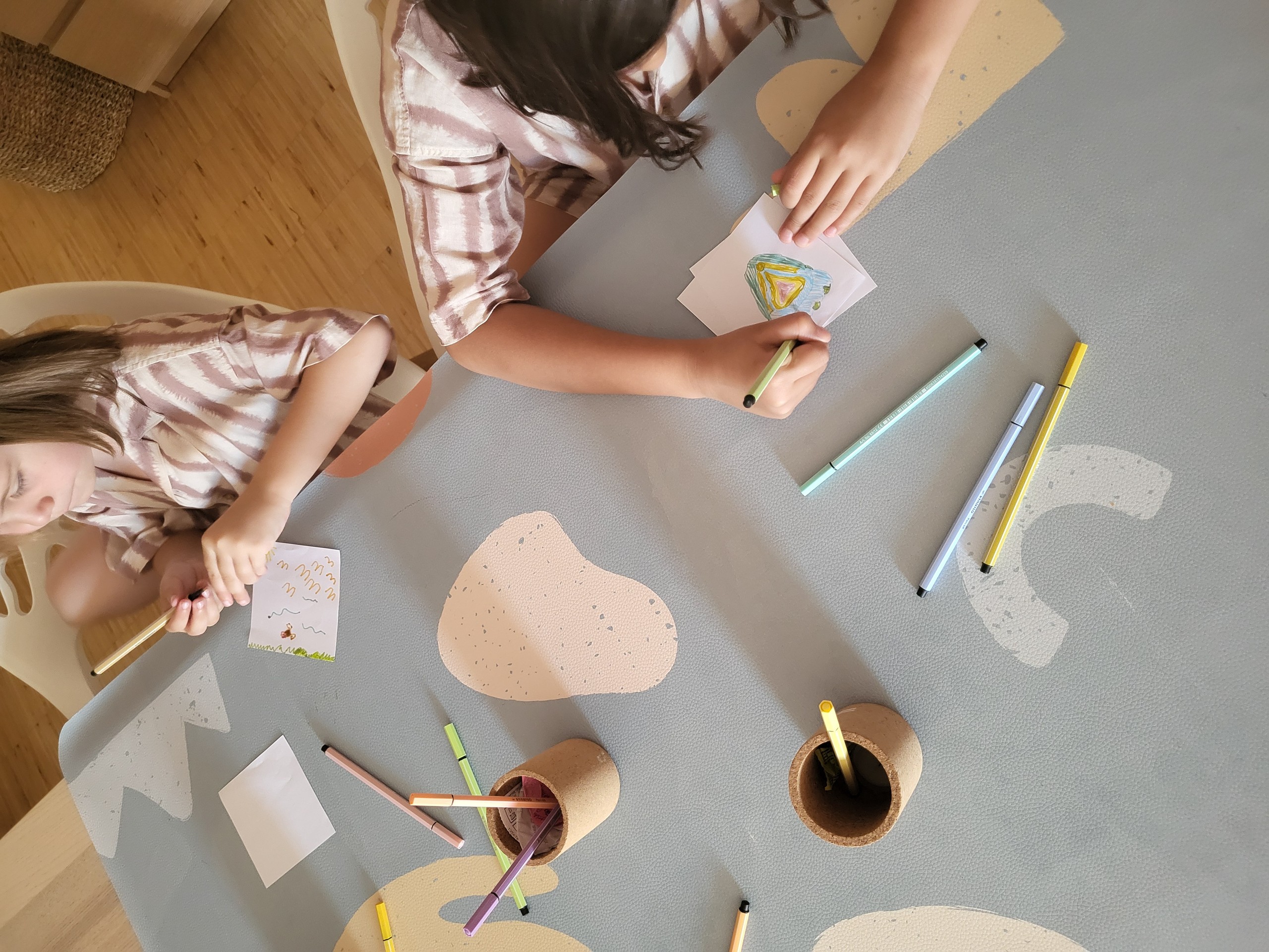 A practical floor mat that looks good in your home. Protects your floors from food, spills, and creative messes. Made from soft, durable vegan leather with a non-slip bottom so it stays in place during mealtime chaos or craft time experiments.
