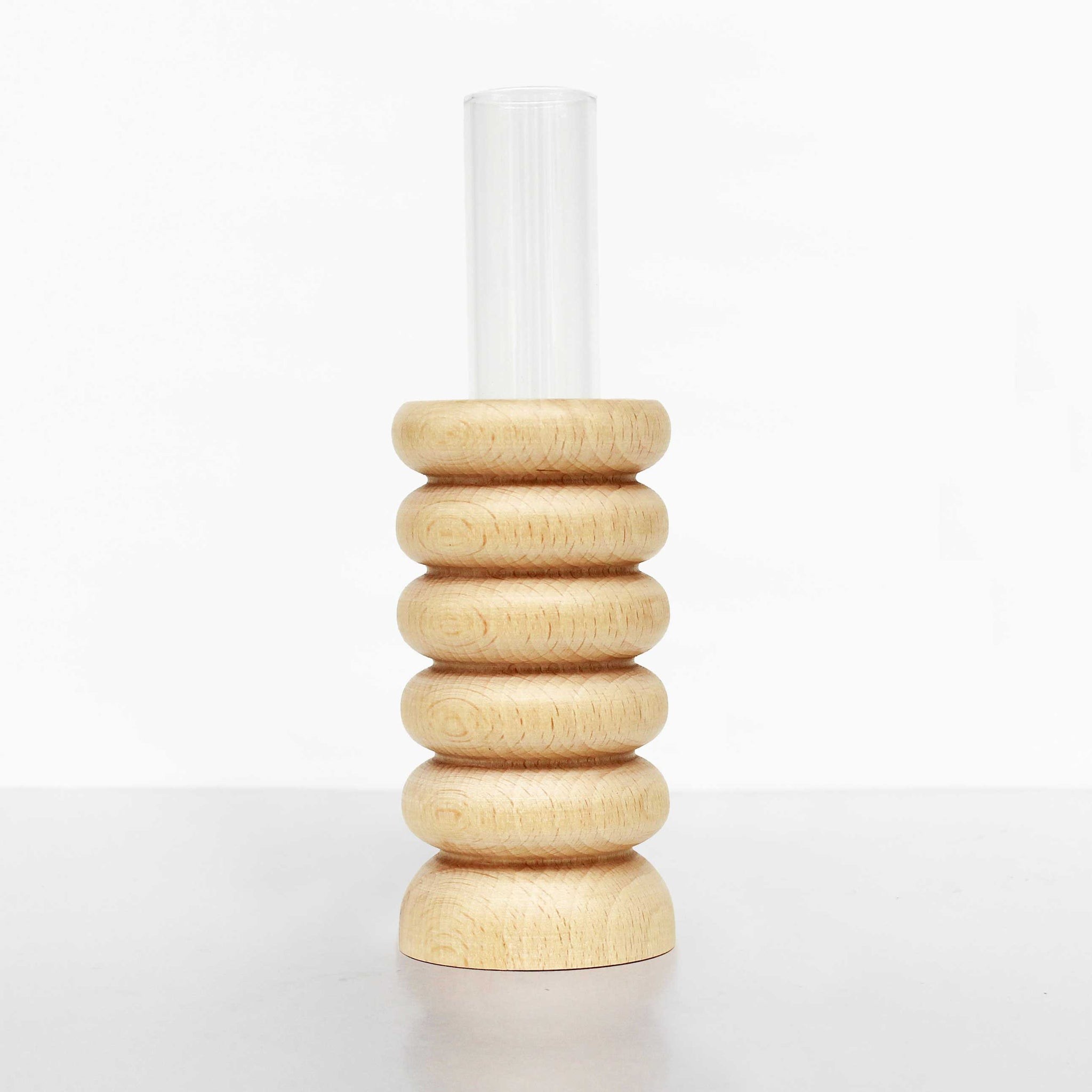 Solid beech wooden base with glass tube vase inserted, handmade in Portugal through the process of wood turning.